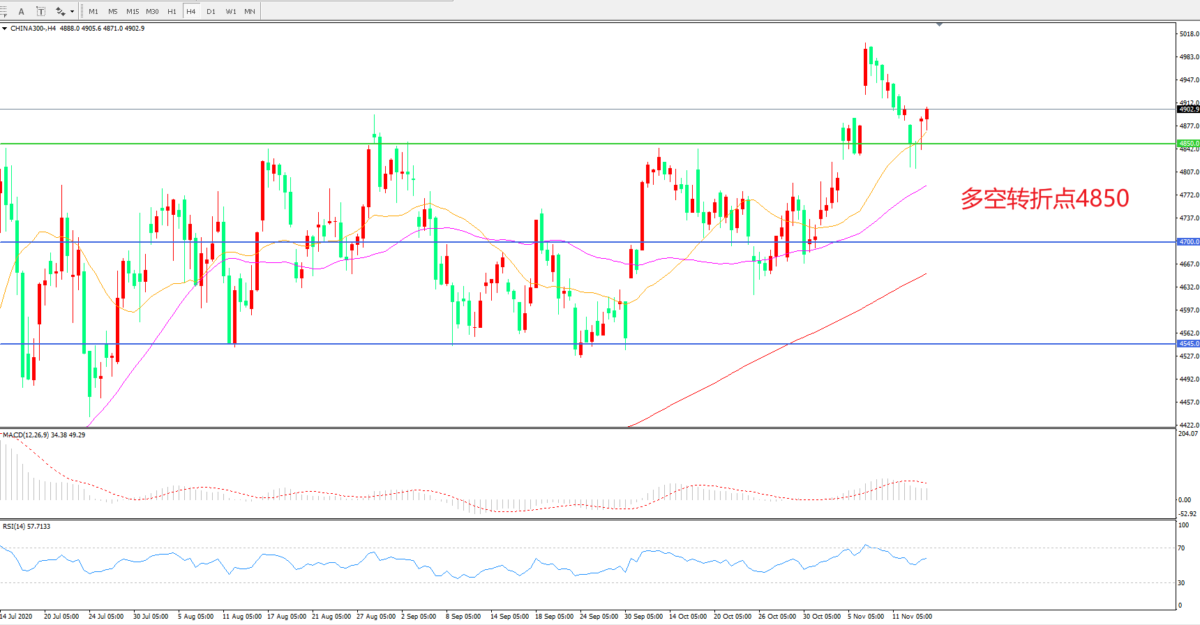 周一(11月16日),两市股指纷纷高开,但高开后不就便震荡回落,沪深300触及21周期均线后小幅拉升,收报4902.9点。整体来看,盘面上呈现一定的分化,但是还是形成本周开门红的表现,另外成交量有增加,算是一种良性的表现。