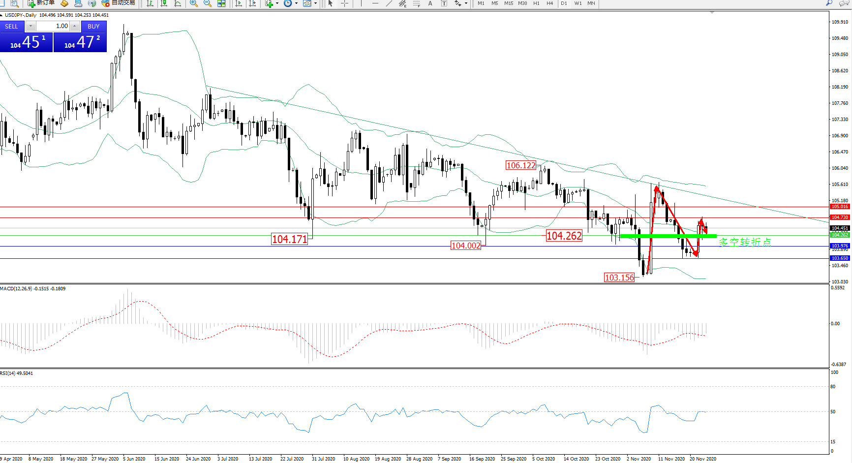 美元兑日圆纠结于104.424附近窄幅整理中,市场风险消息事件匮乏的背景下横盘震荡,波动幅度有限,市场目光进一步聚焦向日内稍后因美国感恩节假日将至而提前集中发布的系列经济数据,在此之前,投资者谨慎情绪仍然占了上风。虽然美元兑日元短线走势会因为风险消息事件的影响而暂时波动,但其中期横行盘整的格局暂时不会改变。一方面日本央行的干预预期限制了美元兑日元汇价下行的下限,但另一方面美元自身所面临的美国政治基本面风险困境也限制了汇价突破走高。日本首相菅义伟:政府尽一切努力保护就业和企业。旅游方面的刺激也有助于保护就业。