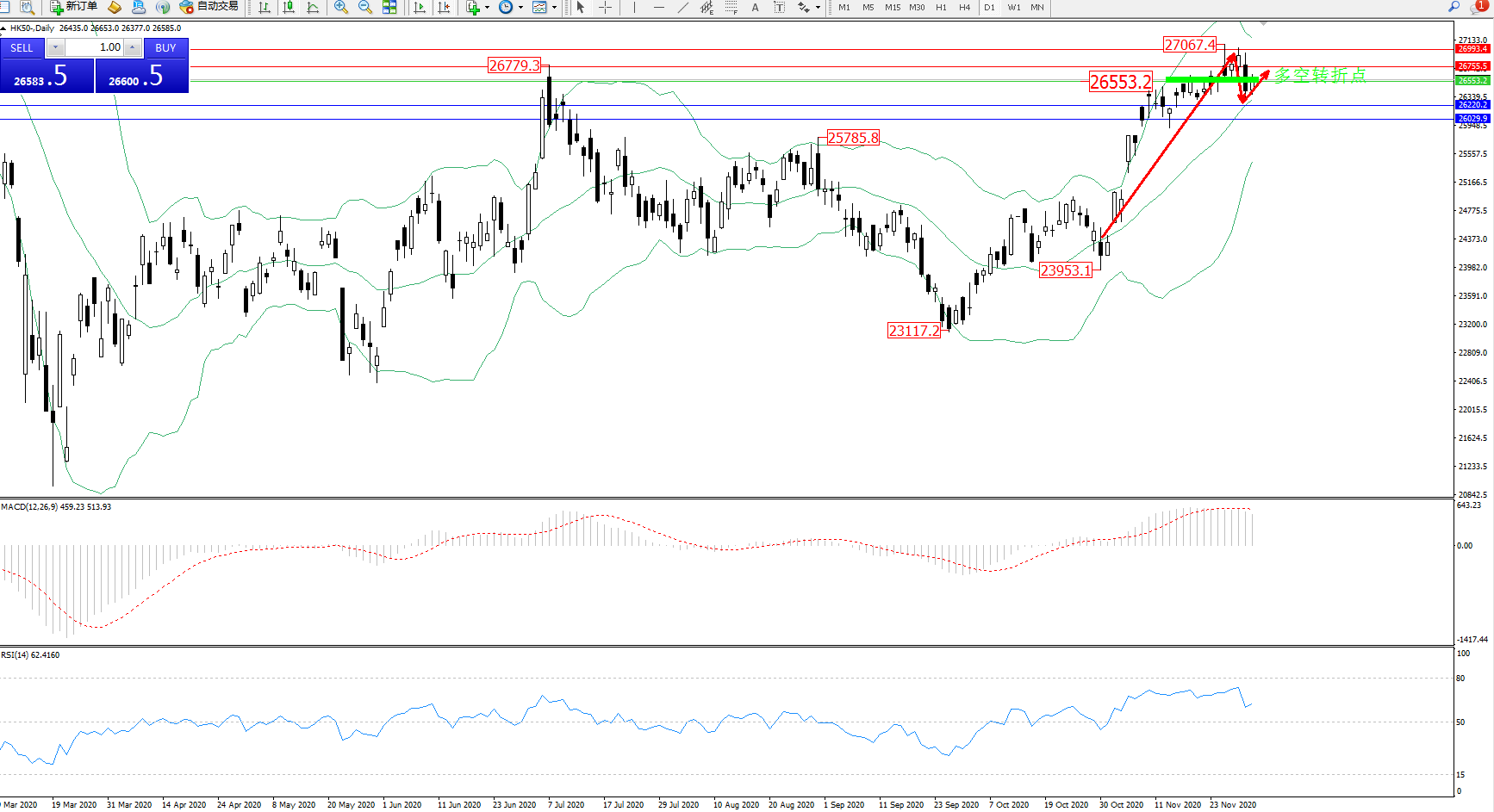 技术点评:多头动力延续布林带指标中上轨区间持续震荡上扬后,高位抵达27067位置遇阻开始震荡下行,触及布林带指标中轨附近节点后开始反转上移,高位空头动力短暂回撤后开始整理平移,布林带指标呈收口走势中,MACD指标处于多头区域高位持续整理平移中,RSI指标处于多头区域高位持续整理下移后徘徊;