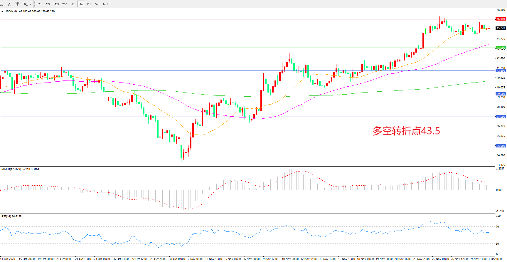 4小时图看,油价延续高位震荡,整体表现相对弱势,55周期均线成为短期支撑,46美元成为中期阻力,MACD红柱减少,RSI指标走平,日内延续震荡概率较大。