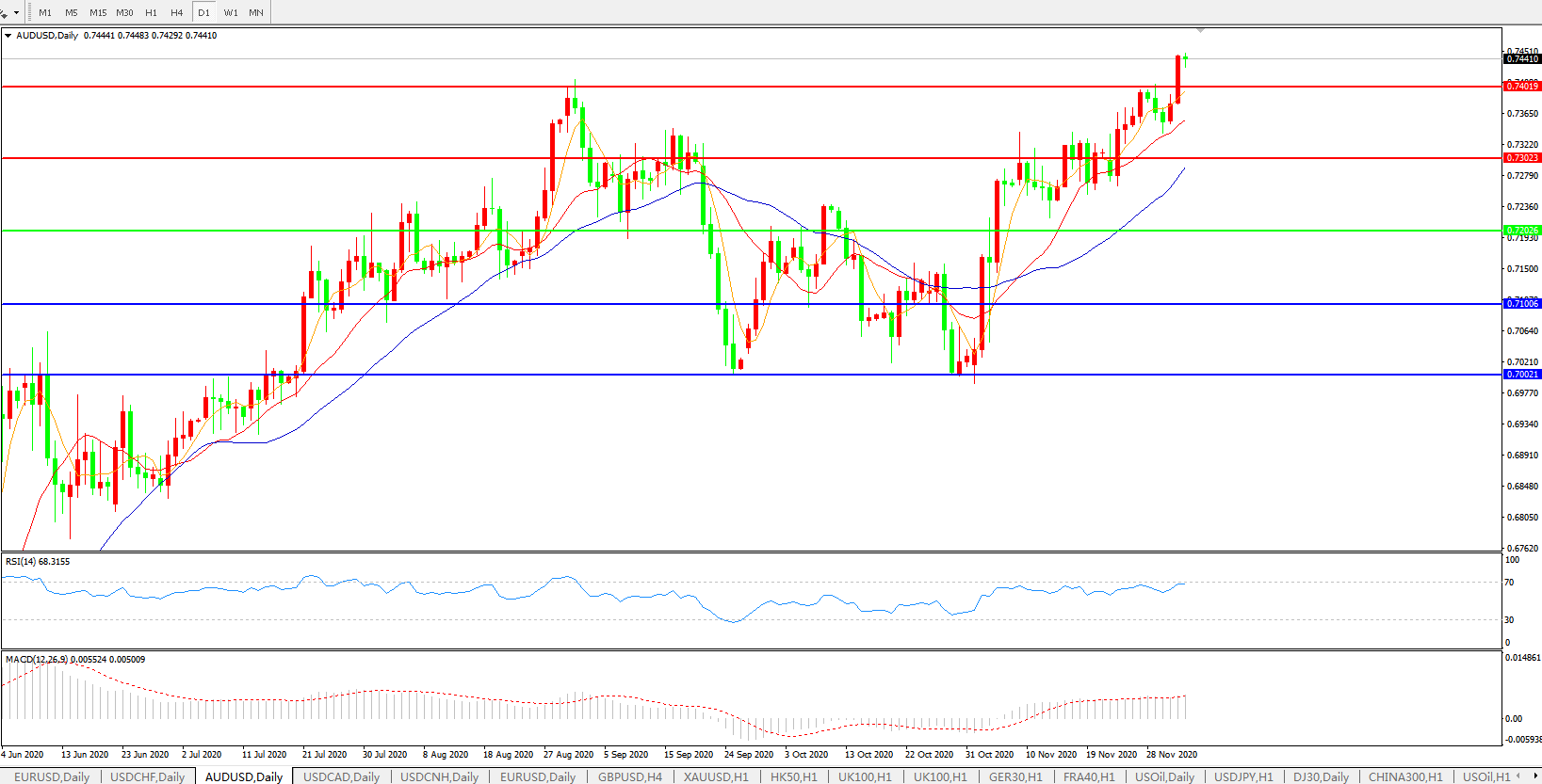 三菱东京日联银行表示,由于新冠病毒疫苗消息积极,市场风险情绪得以提升,澳元前景出现改善,预计2021年一季度末目标上看0.7500,三季度未目标上看0.7700;11月汇价飙升,对新冠病毒疫苗方面的积极消息有所反映,目前新冠病毒疫苗可能较预期更早实现推广,拜登当选美国总统已经加大全球经济增长的积极前景;11月澳洲联储加大量化宽松规模,明确目标是抑制长期债券收益率,可能抑制市场对澳洲固定收益的需求,但量宽政策不会成为打压债券收益率的因素,全球经济复苏更为重要,如果新冠病毒疫苗得以如期推广,尽管澳洲联储采取措施,但债券收益率将提振澳元兑美元澳元兑美元