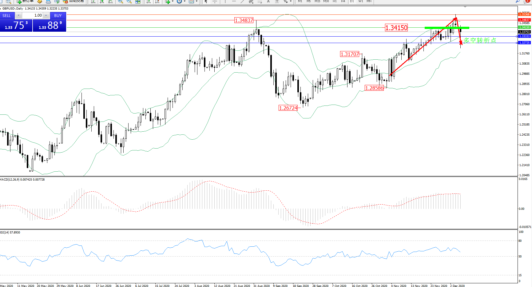 交易策略:1.34150下方看跌,目标1.33333、1.32725
