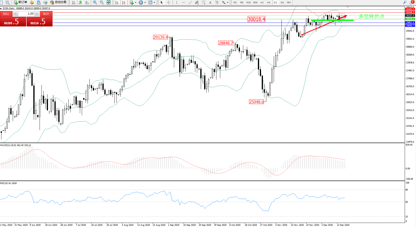 道琼斯指数12月17日(周四)收盘上涨148.80点,涨幅0.49%,报30303.37点。美股收盘,三大指数齐创新高,美国国会周三接近就一项9000亿美元的疫情救助支出计划达成一致,亚洲在从新冠疫情复苏的过程中走在了前面,引发人们预计在新的一年里,随着疫苗在美国推出,刺激是一大推动力。当我们看到国会通过更多的刺激资金时,它给美国经济状况的改善带来了更多的确定性,人们重新获得了更多的自由支出。政府对协议即将达成“持乐观态度”。参议院多数党领袖麦康奈尔、众议院议长佩洛西、参议院民主党领袖舒默和众议院共和党领袖Kevin McCarthy直接参与了谈判,从而提升了援助法案可以迅速在参议院和众议院通过的前景。