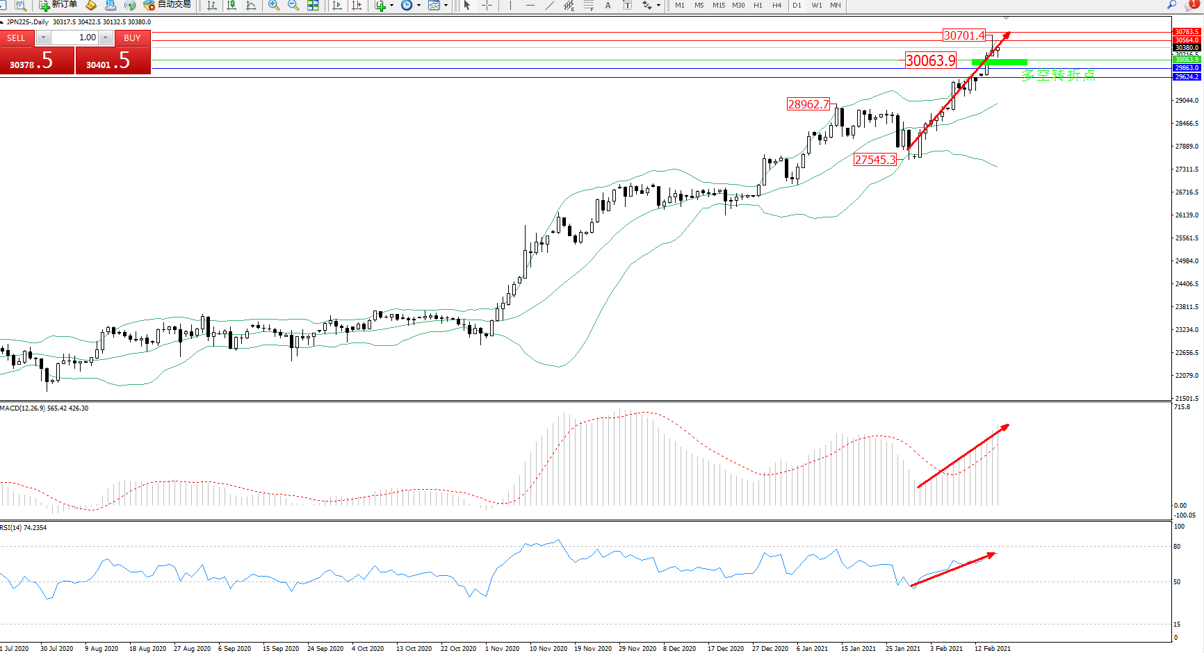 技术点评:多头动力延续布林带指标上轨附近节点持续震荡上扬态势良好,突破布林带指标上轨抵达30701附近节点后有进一步上行态势,布林带指标呈张口走势持续中,关注上轨附近关键转折点,MACD指标处于多头区域维持整理平缓上移中,RSI指标处于多头区域整理向上移动走势中;