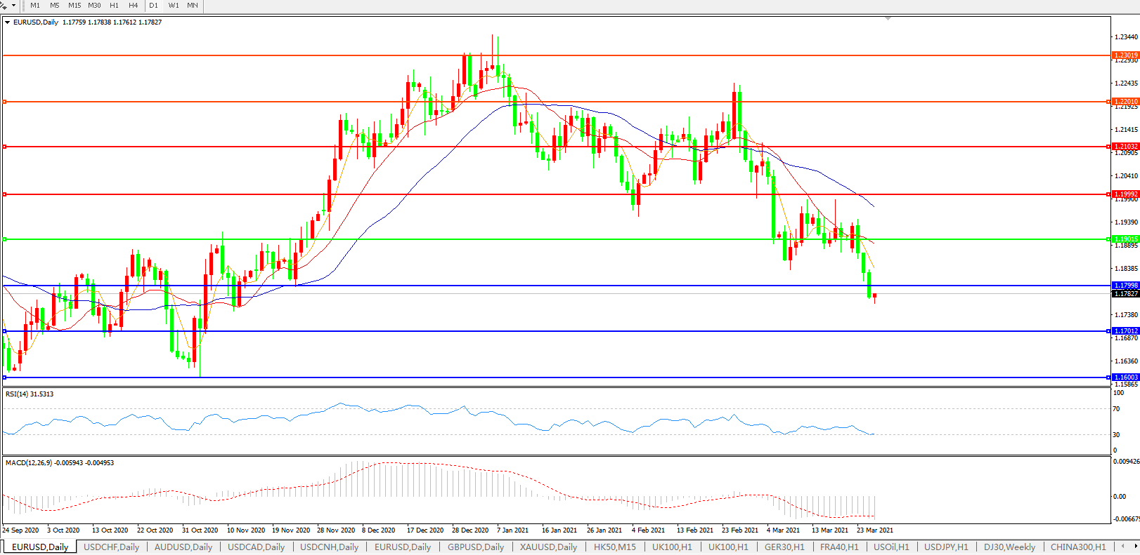 技术面简析:日图短均线呈发散下行态势,汇价持续弱势下行,MACD运行于0轴下方但量能0轴下微放量,RSI震荡走弱,预计短期汇价大概率将进一步走低。