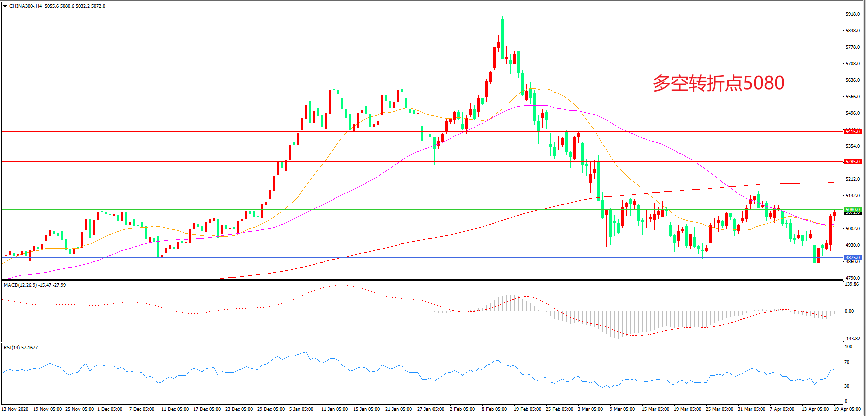 4小时图看,沪深300长阳拉升,触碰整理区间上沿,短期走势有所回暖,均线系统阻力被顺利突破,5080成为多空分水岭,MACD绿柱减少,RSI指标走平,日内如能再度突破,有望开启新一轮上涨行情。