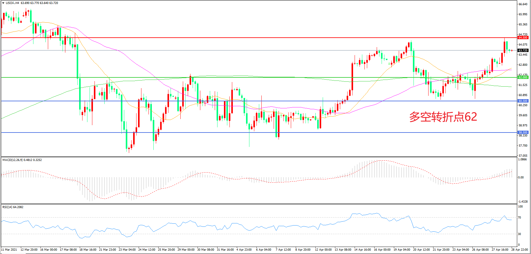 周三(4月28日),美国当周EIA原油库存增加9万桶,好于市场预期,汽油、精炼油库存好坏参半,美国WTI原油大幅上行,收报63.72美元/桶。根据OPEC+预测,在去年需求骤降950万桶/日之后,2021年全球石油需求将增长600万桶/日,随着美国和中国经济强劲反弹,市场对需求前景仍然充满信心,