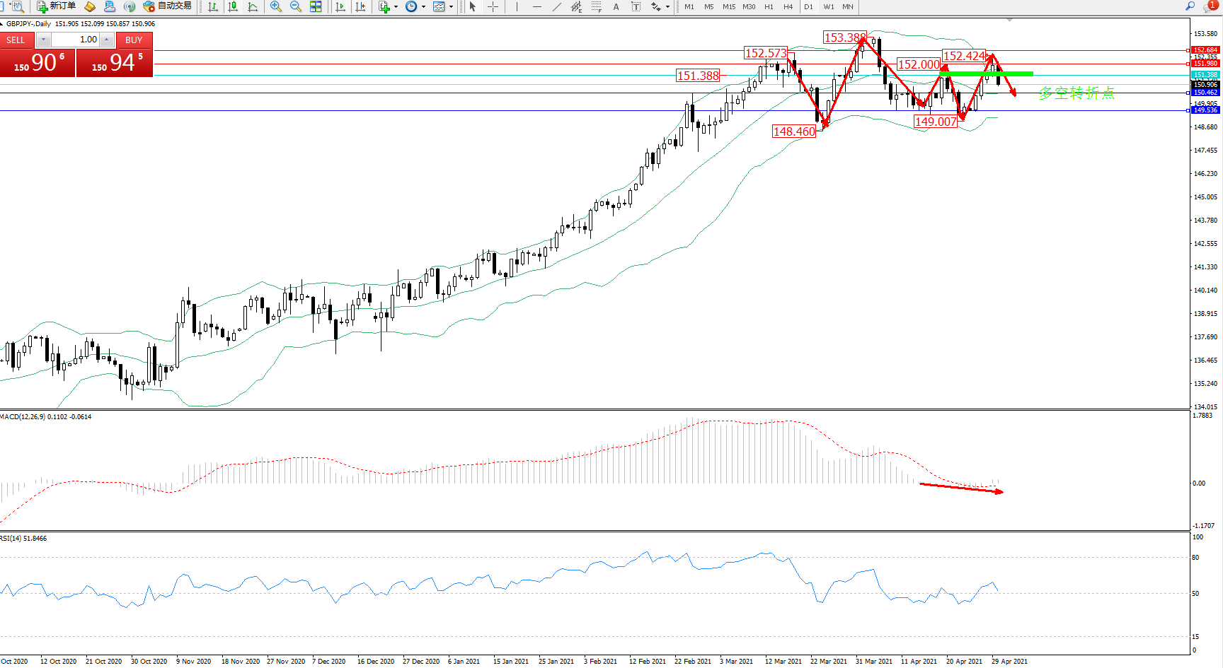 技术点评:长时间维持在布林指标通道宽幅震荡整理持续平移中,多空动力均处于焦灼状态,多次来回试探上下轨区间节点,低位多头再度上移至布林带指标上轨附近破位后抵达152.424位置遇阻回撤,纠结于中上轨区间有继续下行态势,布林带指标呈收口走势后开始有持续平移迹象,MACD指标处于0轴线附近节点弱势徘徊中,RSI指标处于50均衡线上方震荡持续中;