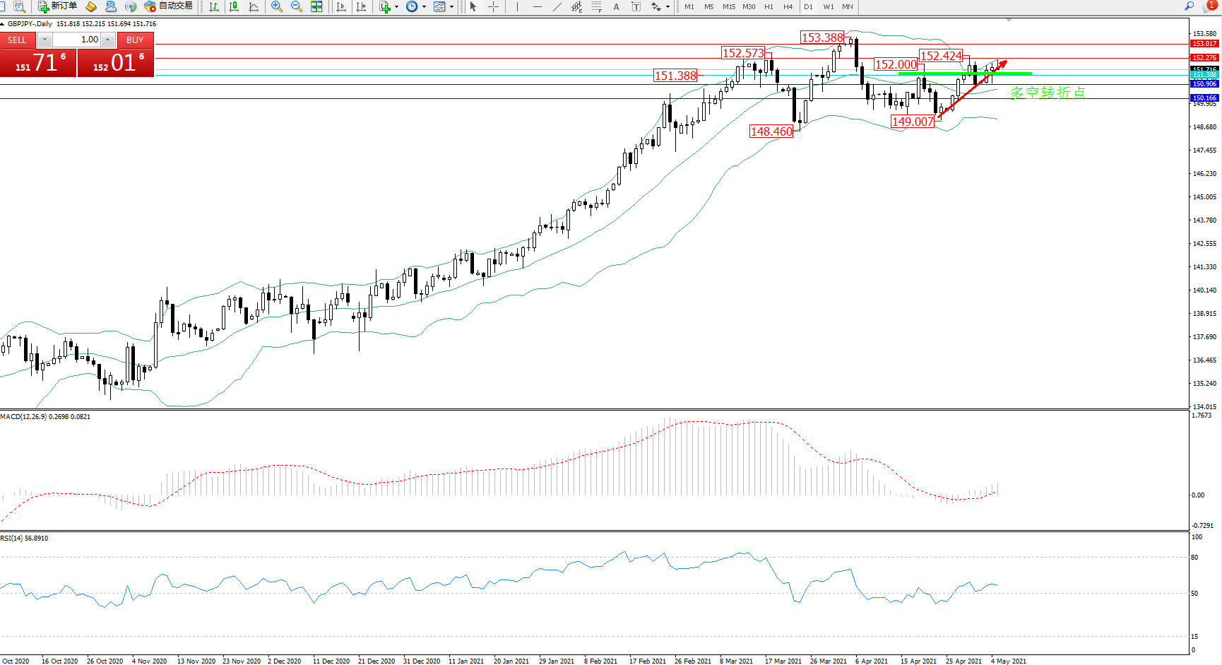 技术点评:长时间维持在布林指标通道宽幅震荡整理持续平移中,多空动力均处于焦灼状态,多次来回试探上下轨区间节点,低位多头再度上移至布林带指标上轨附近破位后抵达152.424位置遇阻维持在中上轨区间震荡中,布林带指标呈收口走势后开始有持续平移迹象,MACD指标处于0轴线上方弱势徘徊中,RSI指标处于50均衡线上方震荡持续中;