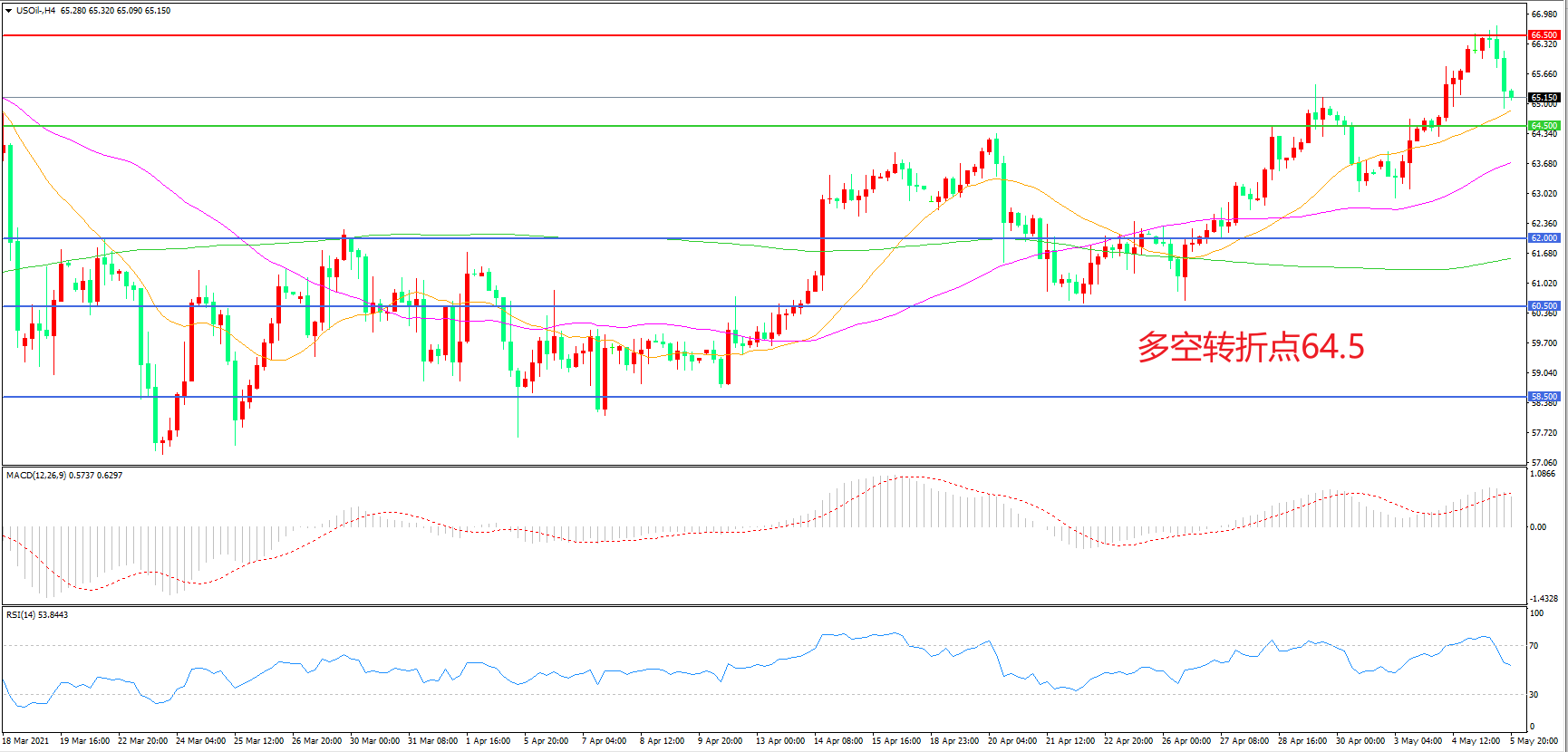 4小时图看,油价冲击66.5美元附近后快速回落,短期涨势受到遏制,但形态上依然处于多头趋势之内,均线系统呈多头排列,MACD红柱缩短,RSI指标向下,日内震荡上行概率较大。