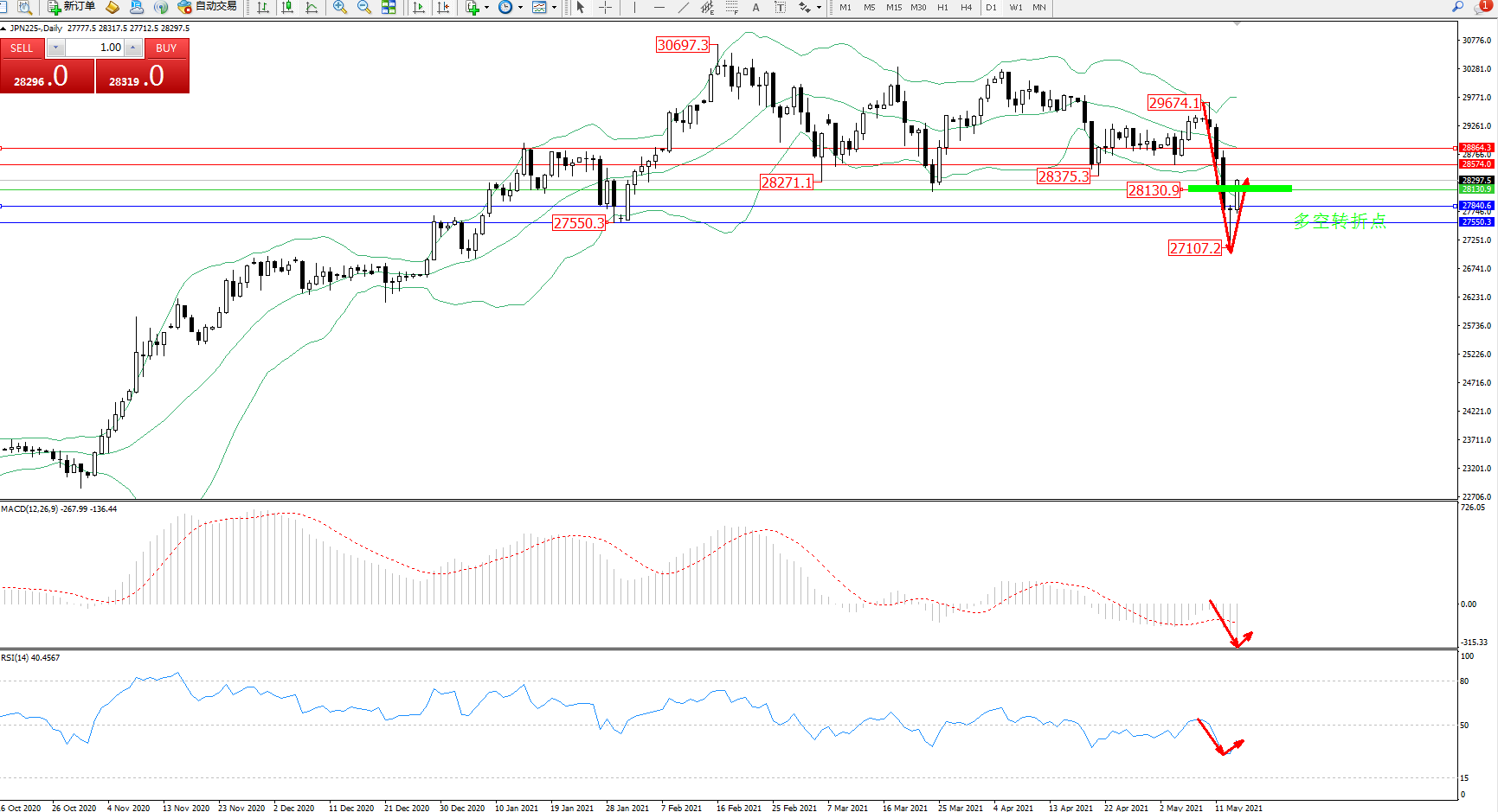 技术点评:空头动力急速下挫至27107位置后得到支撑,快速反转呈V型上移,回归至下轨内侧不断向上移动中,布林带指标呈张口走势后有收口迹象,低位多头动力强势反转回升依旧持续中,MACD指标处于0轴线下方空头区域维持缓慢下移后开始平移,RSI指标处于50均衡线下方空头区域维持震荡后反转上移;