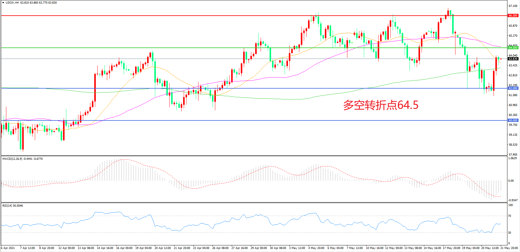 上周五(5月21日),大宗商品全线大回调,周初一度借助消息炒作冲高的原油也出现了连续大跌,美国WTI原油震荡回调,收报63.83美元/桶。短期来看,原油市场目前依旧比较弱势,不排除油价会继续试探60—62美元/桶区间,但只要OPEC+持续对市场进行干预,原油市场就不存在大幅下行的基础,而且随着需求恢复,库存水平在未来一段时间内会不断走低,这将在基本面上支撑价格上行。
