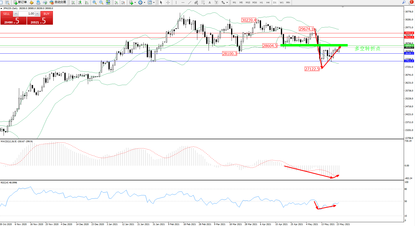 技术点评:空头动力急速下挫至27122位置后得到支撑反转上移,纠结于中下轨区间震荡,空头动力维持低位宽幅震荡回升中,触及中轨附近节点后持续徘徊,布林带指标呈张口走势态势良好,关住中轨附近关键节点,MACD指标处于0轴线下方空头区域维持震荡持续整理,RSI指标处于50均衡线下方空头区域维持震荡回升中;