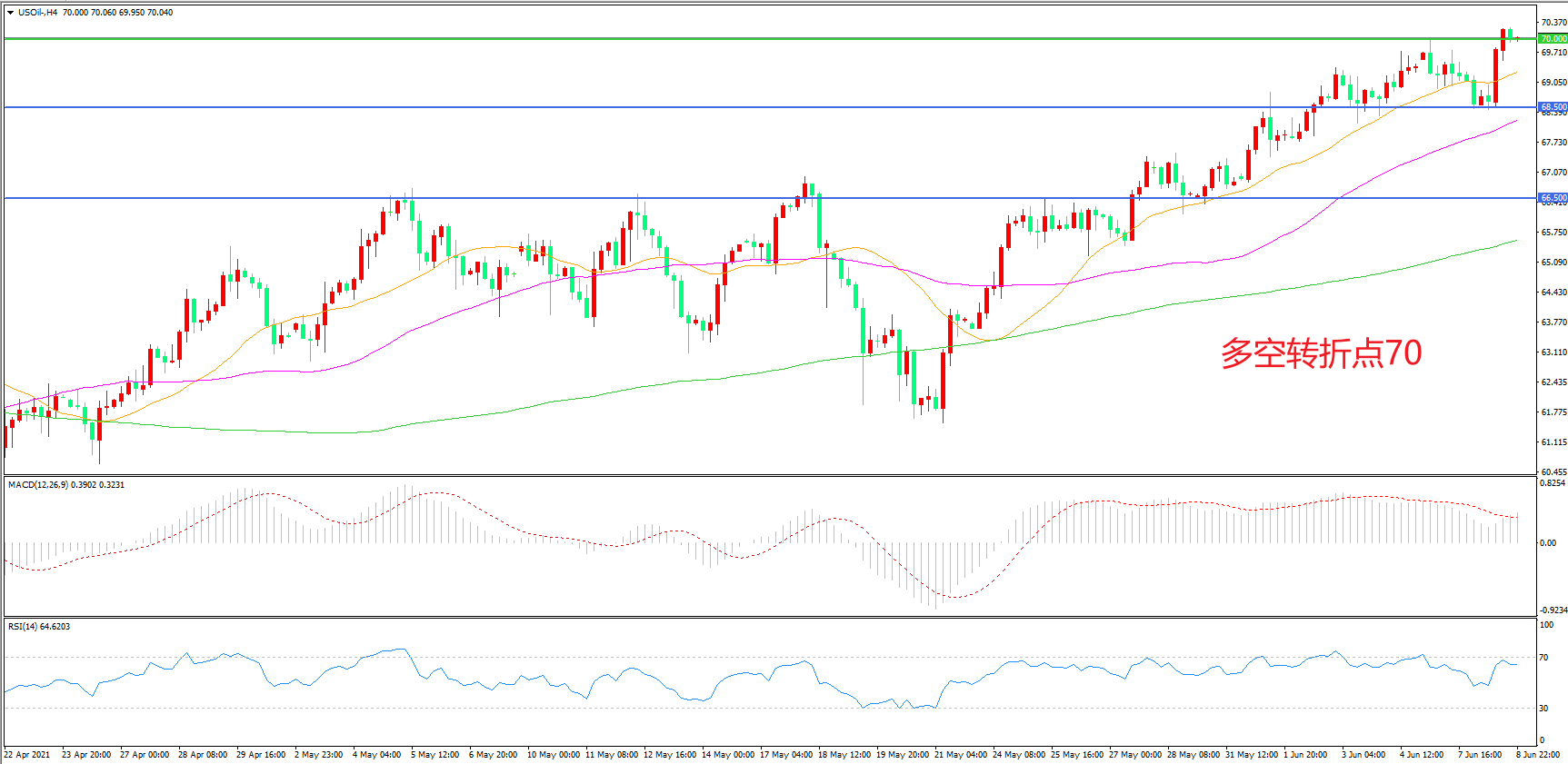 周二(6月8日),油价乘利比亚管道泄漏影响和EIA短期能源报告利多推动再度飙升,美国WTI原油两年半来首破70美元,从当前油价对利多和利空的反应来看,主流观点仍然是明显倾向于看涨为主。不过凌晨API报告原油和成品油库存数据均不及预期,给火热市场情绪降了点温,重点关注晚间22:30分的EIA数据表现,如果EIA数据能够“扭转乾坤”,油价有望再度冲高。