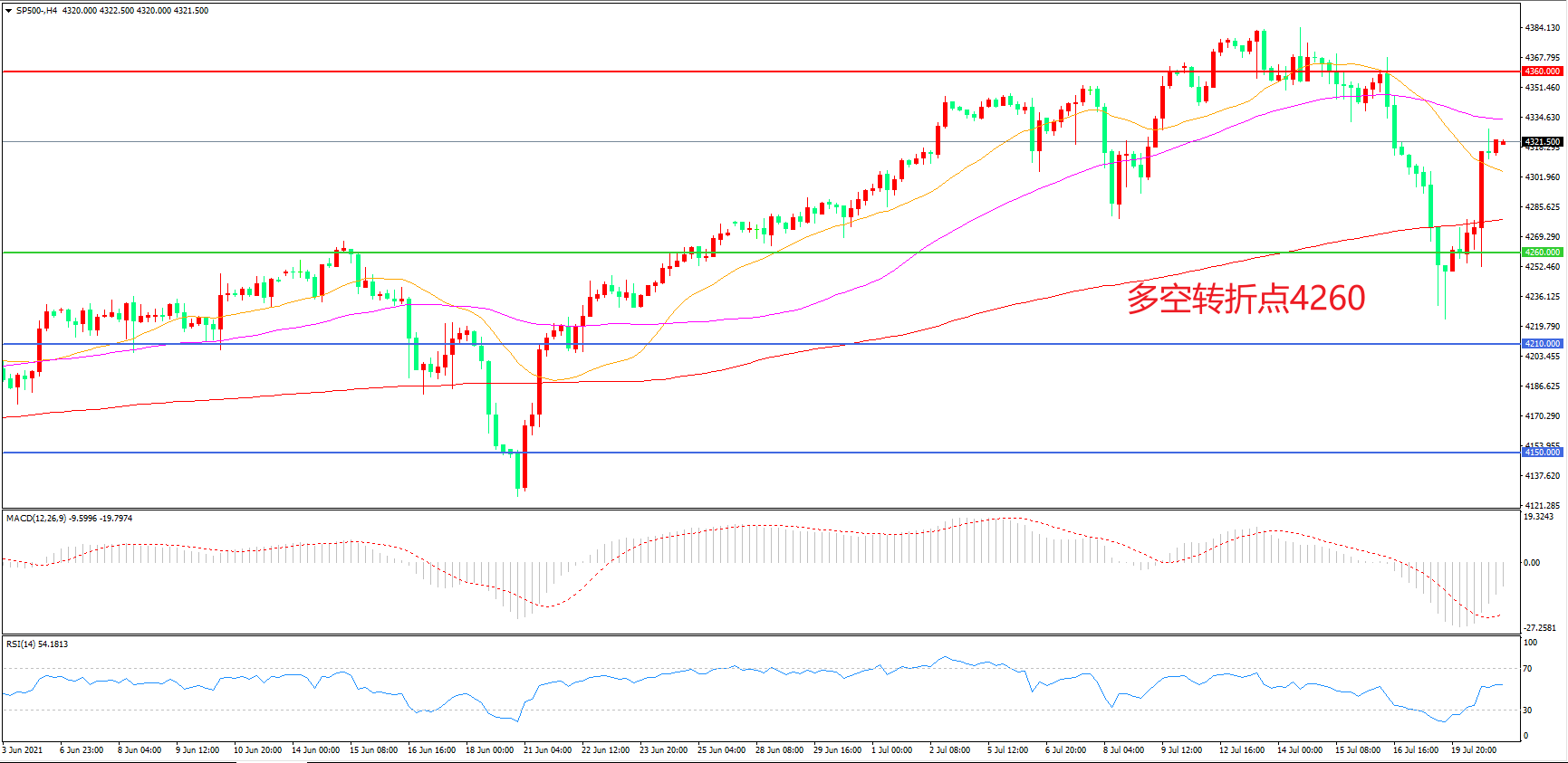 4小时图看,标普500回踩4260一线后大幅反弹,再度站上200周期均线,短线行情有所回暖,均线系统走平, MACD绿柱缩短,RSI指标走平,日内延续震荡概率较大。