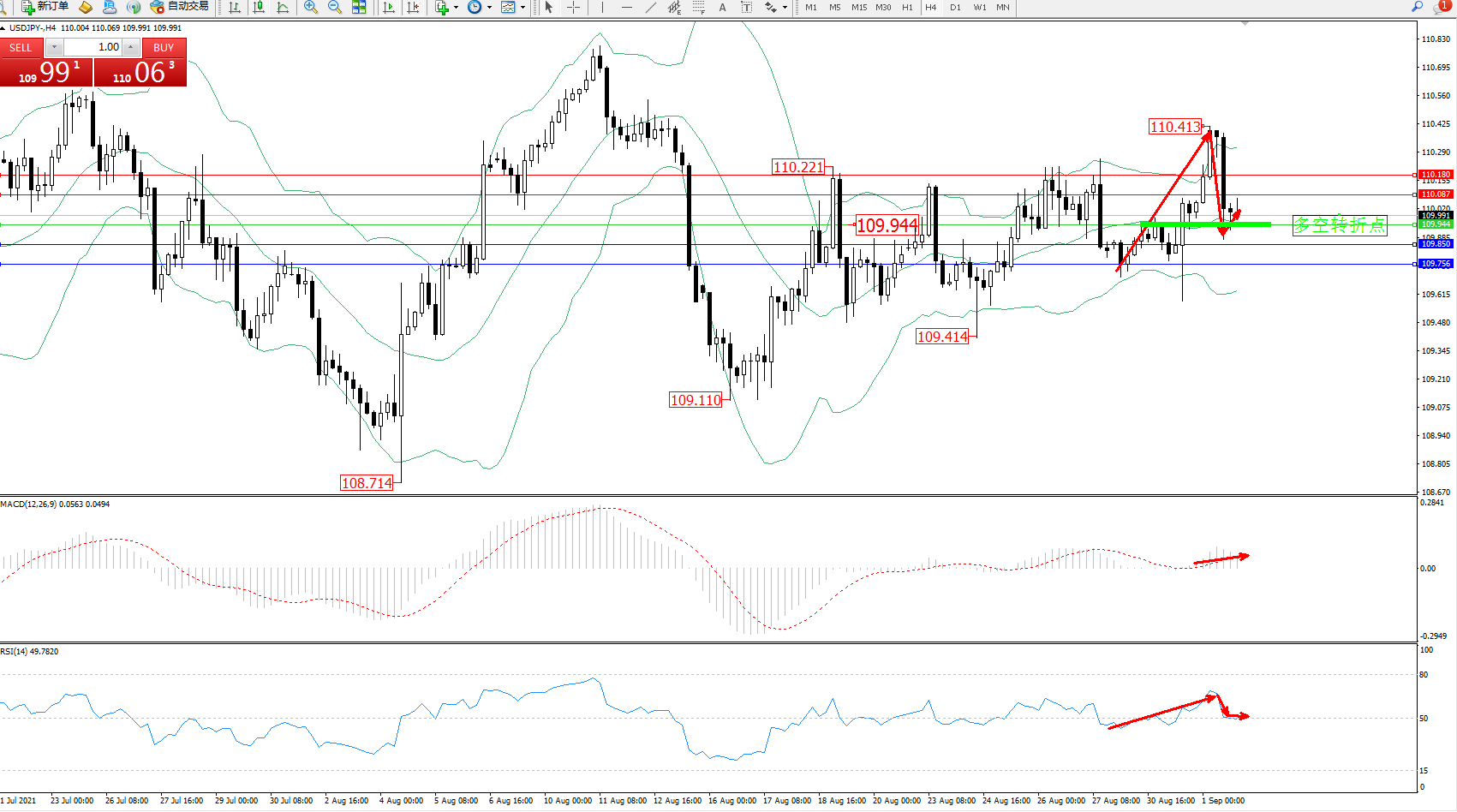 技术点评:多头动力延续布林带指标通道内强势冲高至110.413位置节点后遇阻回撤,纠结于布林带指标中轨附近弱势震荡,短期或维持在中轨附近整理,布林带指标呈张口走势后开始有收口迹象,MACD指标处于0轴线上方弱势徘徊中,RSI指标处于50均衡线附近持续整理中;