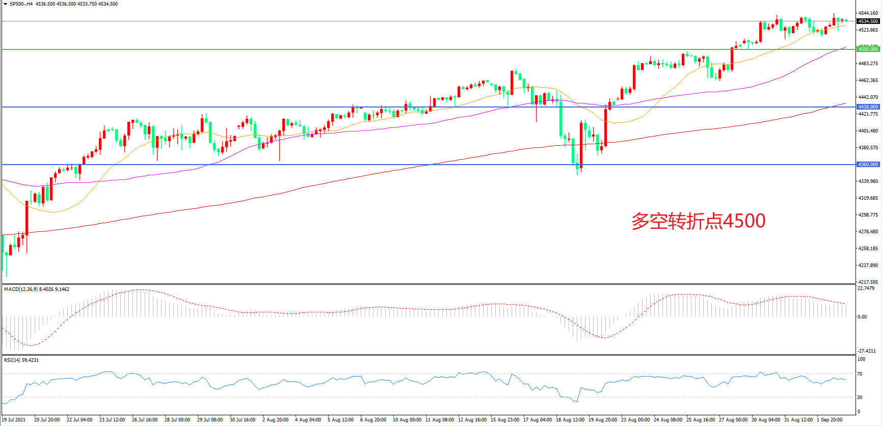 周四(9月2日),美国上周首次申请失业救济人数超预期下降,刷新疫情爆发一年多来新低,优于预期的数据推动美股高开,标普500震荡上行,收报4535点。美联储主席鲍威尔上周五表示,就业复苏将决定缩减资产购买计划的时机,使得今晚的非农就业报告尤其引人注目,目前市场预计将增加75万人,如果实际数据与此有较大出入将会引发市场的巨幅波动,务必重点关注。