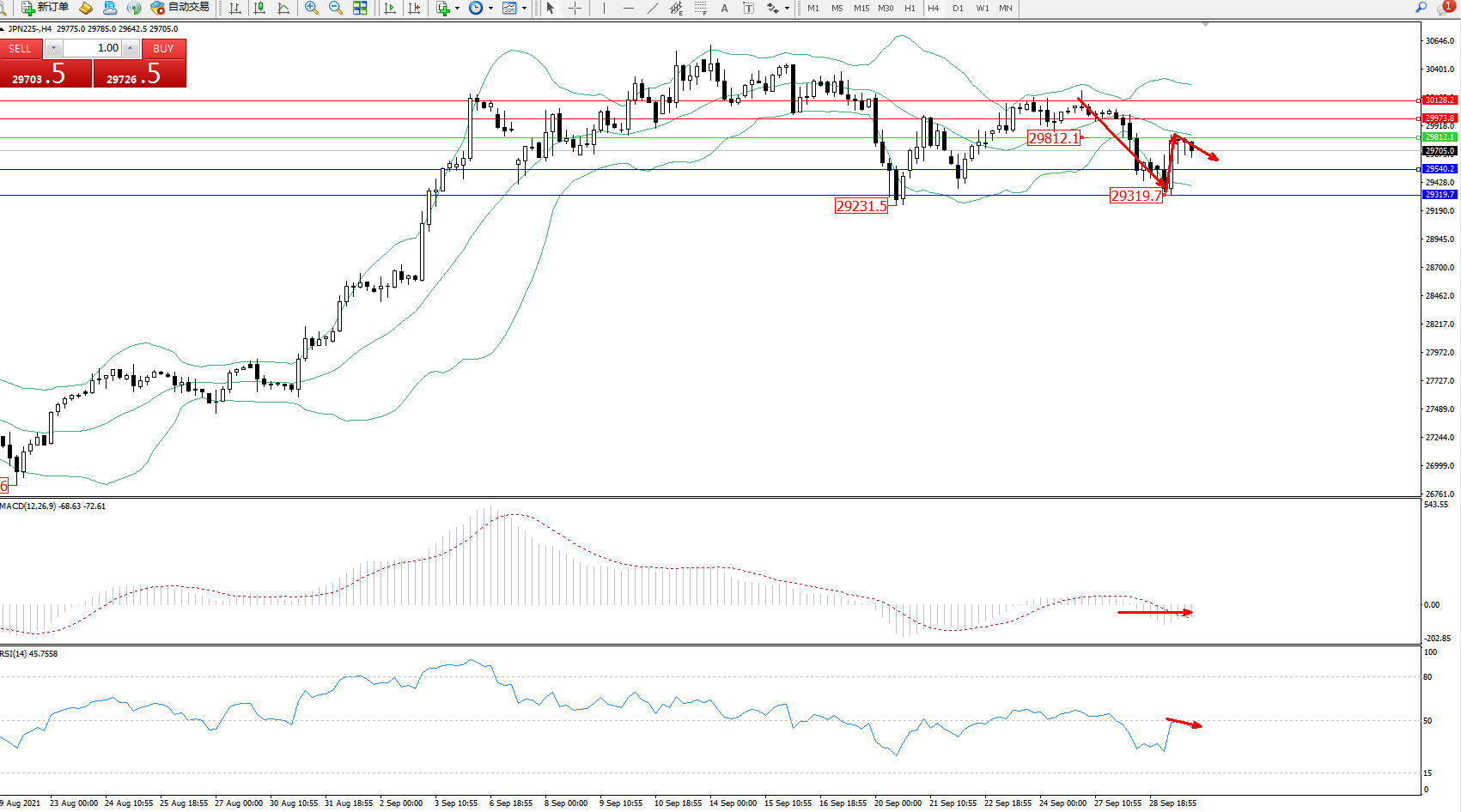 技术点评:空头动力维持布林带指标通道中下轨区间持续震荡,低位抵达29319位置短暂得到支撑回升后空头动力再度下行,布林带指标呈缓慢收口走势中,MACD指标处于0轴线下方空头区域维持整理平移,RSI指标处于50均衡线附近维持弱势震荡中;