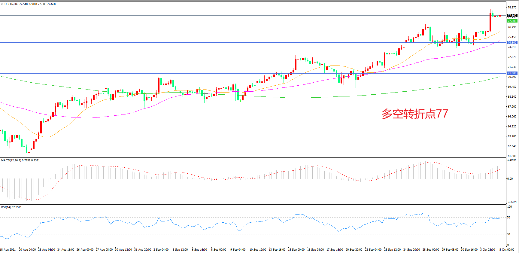 4小时图看,油价回踩21周期均线后长阳拉升,短期表现较强,77美元成为短期多空分水岭,MACD红柱增加,RSI指标走平,日内延续上行概率较大。