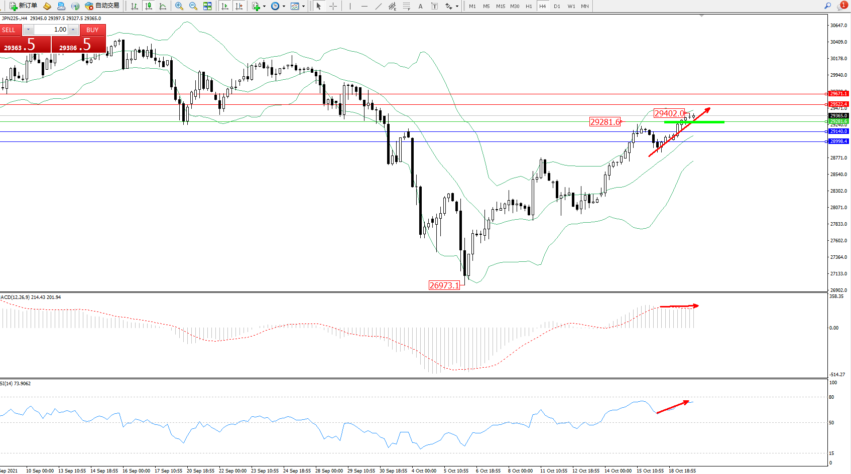 日经225指数10月19日(周二)收盘上涨205.54点,涨幅0.71%,报29231.00点。日本众议院选举于19日发布告示,31日开始投计票,连续12天的选战正式开始。日本各党党首围绕新冠疫情对策、经济与分配政策等展开交锋;日本新冠疫苗接种量累计达1.810亿剂,已有67.4%的人口完全接种新冠疫苗。据报道,日本首相岸田文雄(自民党党首)针对新冠疫情称,“应在唤起需求方面下力气”,表示将确保病床并实施大型经济对策,“提倡新资本主义,通过增长与分配的良性循环提升大家的收入”。