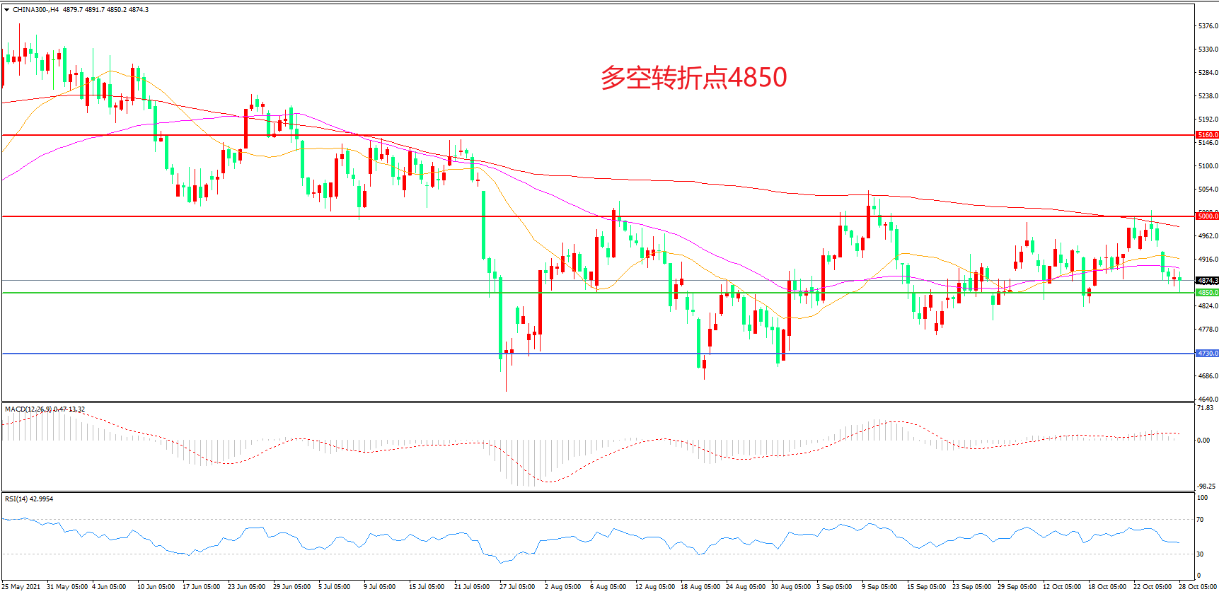 4小时图看,沪深300低开低走,整体延续区间震荡形态 ,4850成为短线支撑,200周期均线成为上方阻力,MACD红柱减少,RSI指标走平,日内延续震荡概率较大。