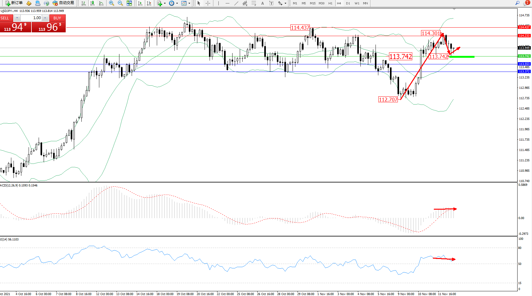 技术点评:低位多头动力强势拉升上扬,高位抵达114.301位置短期遇阻回撤,空头动力有伺机入场迹象,但整体走势依旧处于上移趋势,短期或初级布林带指标中轨附近节点,布林带指标呈张口走势后开始上移缓慢有收口迹象,MACD指标处于多头区域维持整理平移,RSI指标处于多头区域维持窄幅整理下移;