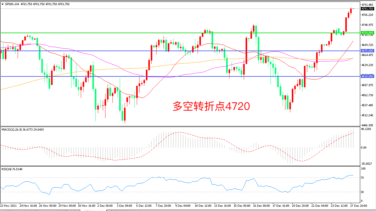 4小时图看,标普500长阳拉升,短线走势偏强,均线系统拐头向上,4720成为多空分水岭,MACD红柱增加,RSI走平,日内延续上行概率较大。