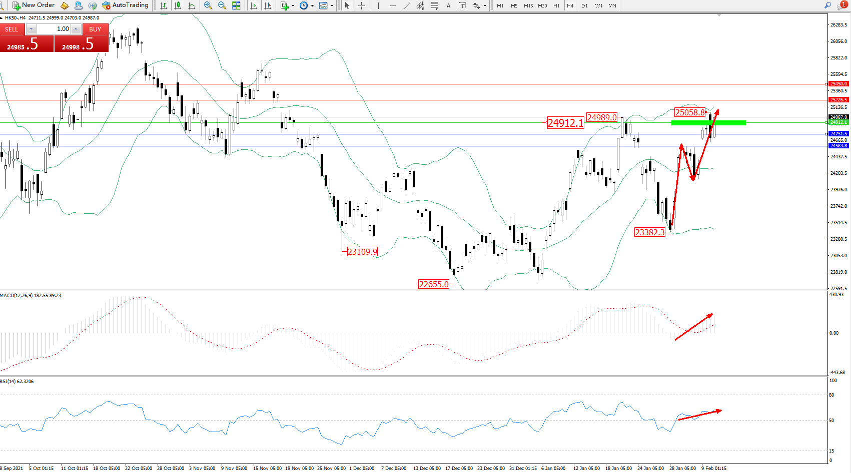 香港恒生指数2月10日(周四)收盘上涨94.36点,涨幅0.38%,报24924.35点;港股三大指数午后回升转涨,延续昨日上涨行情。恒生科技指数涨0.56%,三者均高开下探收假阴线。大型科技股多数上涨,阿里巴巴、美团、京东皆有涨幅。抗疫概念股表现最差,药明系午后跌幅收窄,药明康德收跌1%,盘中一度大跌超8%,电信股、家电股走低明显。南下资金净流入15.16亿港元,大市成交额为1291亿港元。