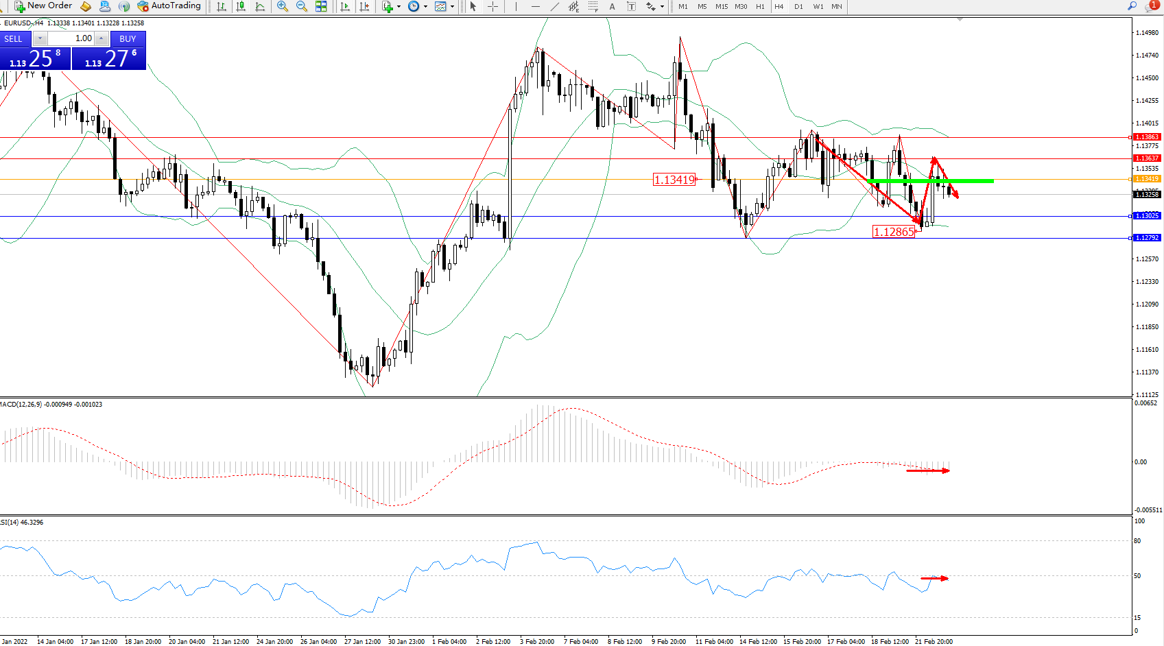 交易策略:1.13419下方看跌,目标1.13025、1.12792
