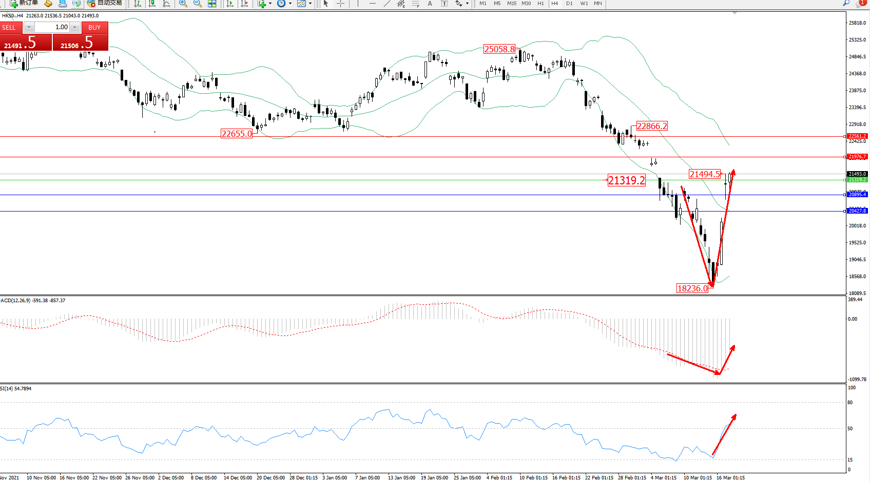 香港恒生指数3月17日(周四)收盘上涨1413.73点,涨幅7.04%,报21501.23点;港股延续昨日大反弹行情,市场情绪得以回稳。恒指涨7.04%重回21000点上方,2天连续收复3大整数关口,恒生科技指数涨7.76%,2日涨幅超千点,收复4500点大关。大型科技股继续反弹,百度涨超16%,京东涨15.85%,阿里巴巴、美团涨超12%,腾讯涨超6%;香港金管局总裁余伟文发文表示,香港的金融体系底子雄厚,外汇储备是本地生产总值(GDP)的136%,银行体系资本充足率为20.4%,两者均比2008年金融海啸时显著高出约30%,为香港金融市场提供强大坚固的缓冲和抗震力,足以抵御外在因素引发的市场震荡。自乌克兰局势升级以来,港元市场如常有序运作,港元汇率稳定,未察觉资金流动出现异常情况,亦无迹象显示有大规模沽空或冲击港元;股票市场虽然随外围市况大幅波动,但市场交易维持顺畅正常。