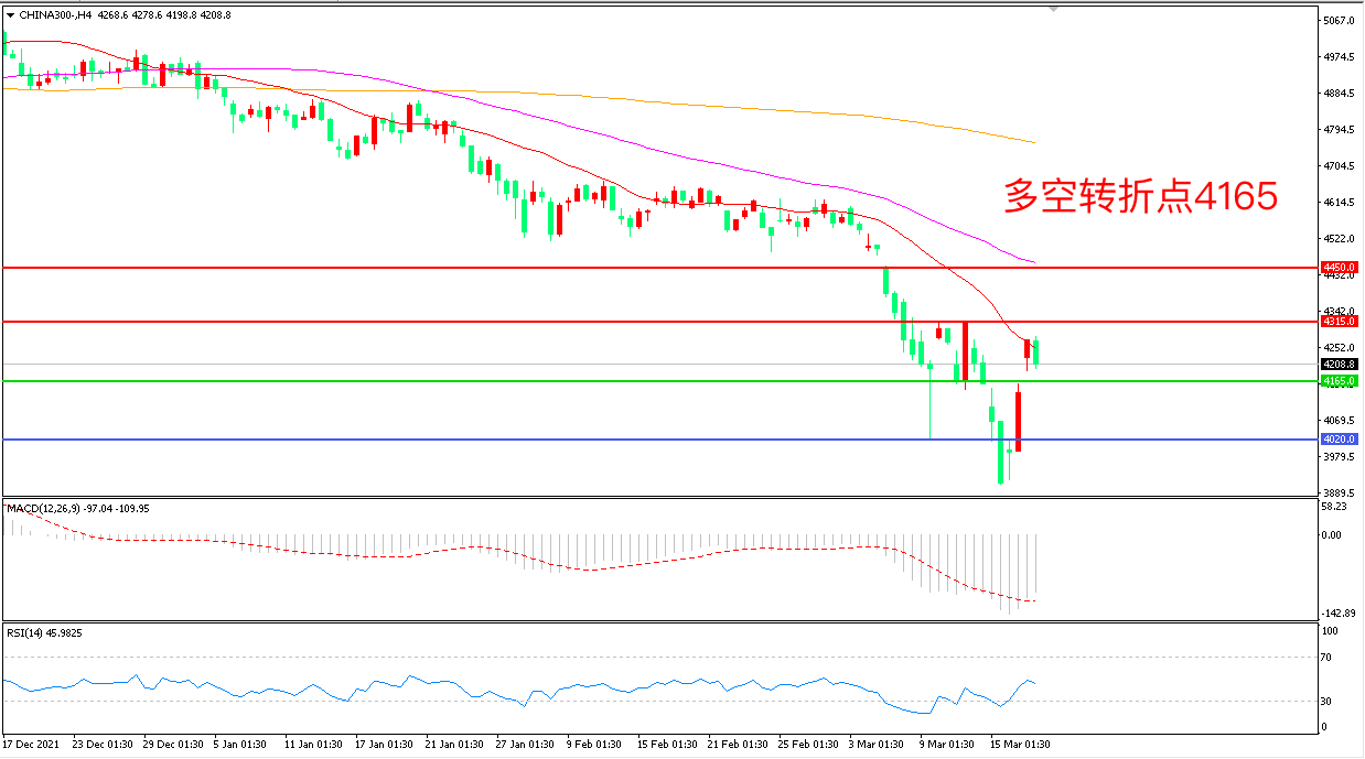 4小时图看,沪深300 高开后一度上行,触碰21周期均线后小幅回落, MACD绿柱缩短,RSI指标走平,日内小幅反弹概率较大。