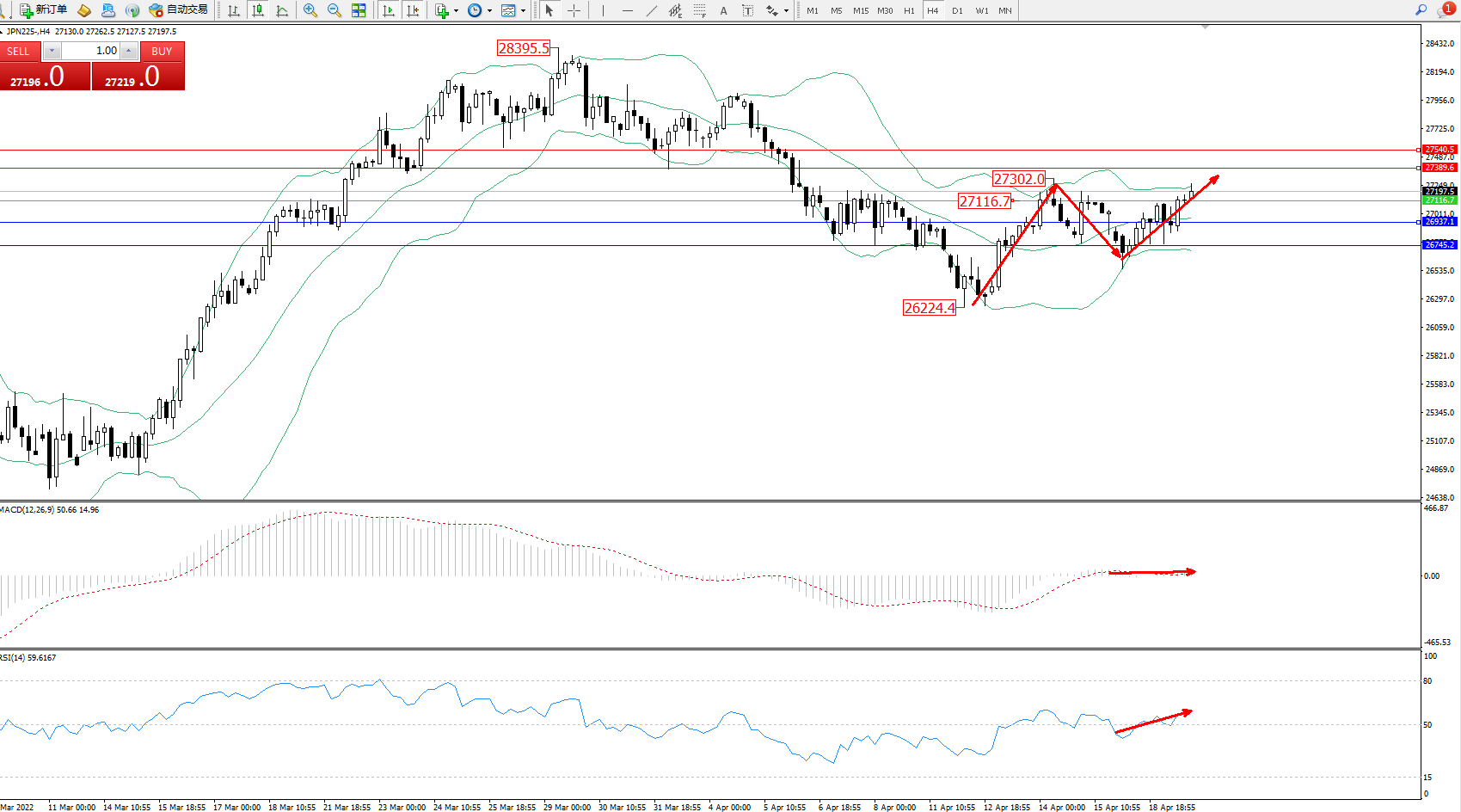 日经225指数4月19日(周二)收盘上涨199.79点,涨幅0.75%,报26999.50点。日本财务大臣铃木俊一:今天下午将出发参加G20峰会。与美国外汇部门就外汇问题进行密切沟通。日本卫生部已批准诺瓦瓦克斯医药生产的新冠疫苗,最快5月底对18岁以上施打;日本金融厅打算整合公司的季度报告要求,希望在为股东保持透明度的同时减轻企业的负担;日本首相岸田文雄和新西兰总理阿德恩将于本周在日本举行峰会。重要的是与美国和其他国家密切沟通。目前正在与美国讨论举行双边会谈。