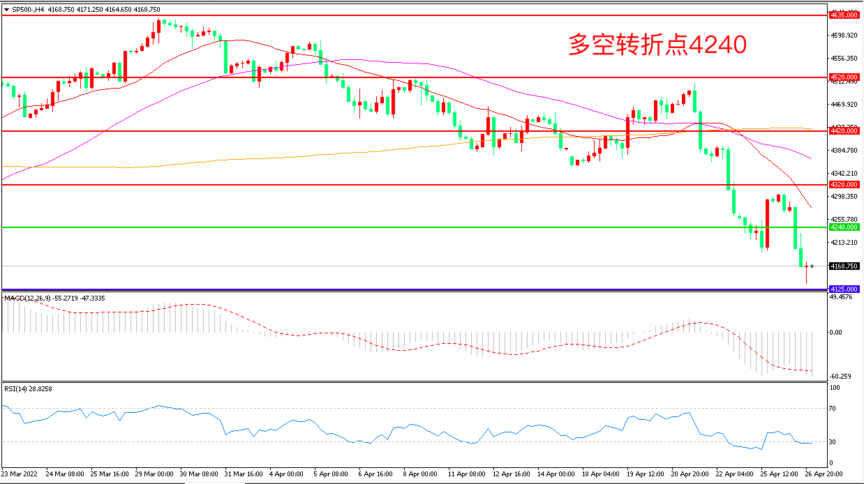 周二(4月26日),美国经济数据表现不佳,引发市场对增长失速的担忧,作为风险资产龙头的美股持续下跌,标普500长阴下坡,收报4169.55点。短期看,市场情绪持续受到欧美央行即将加息、通胀居高不下、经济增长放缓和俄乌冲突持续的多重负面因素影响,明星科技股普跌,如果GDP与PCE指数表现不佳,美股恐再次迎来重挫。