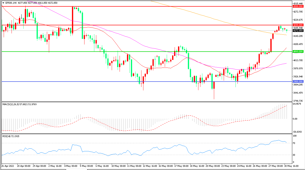 4小时图看,标普500延续高位震荡,短线走势偏强,4060成为短线支撑,MACD红柱增加,RSI指标走平,日内延续上行概率较大。