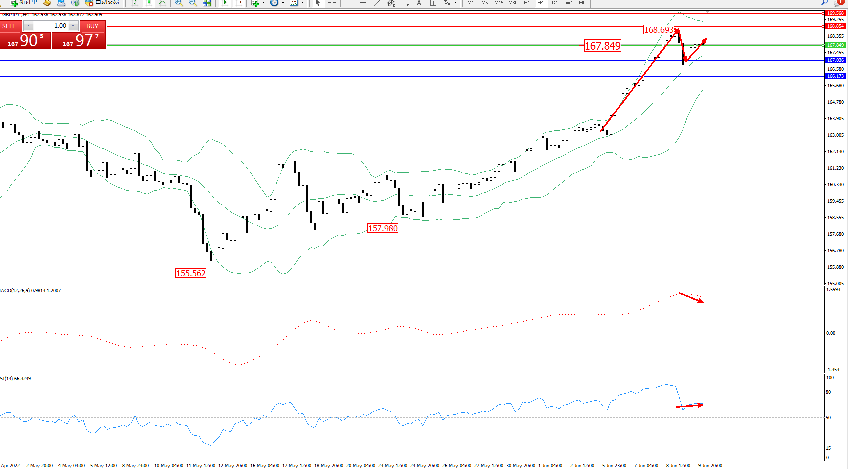 交易策略:167.849上方看涨,目标168.854、169.568