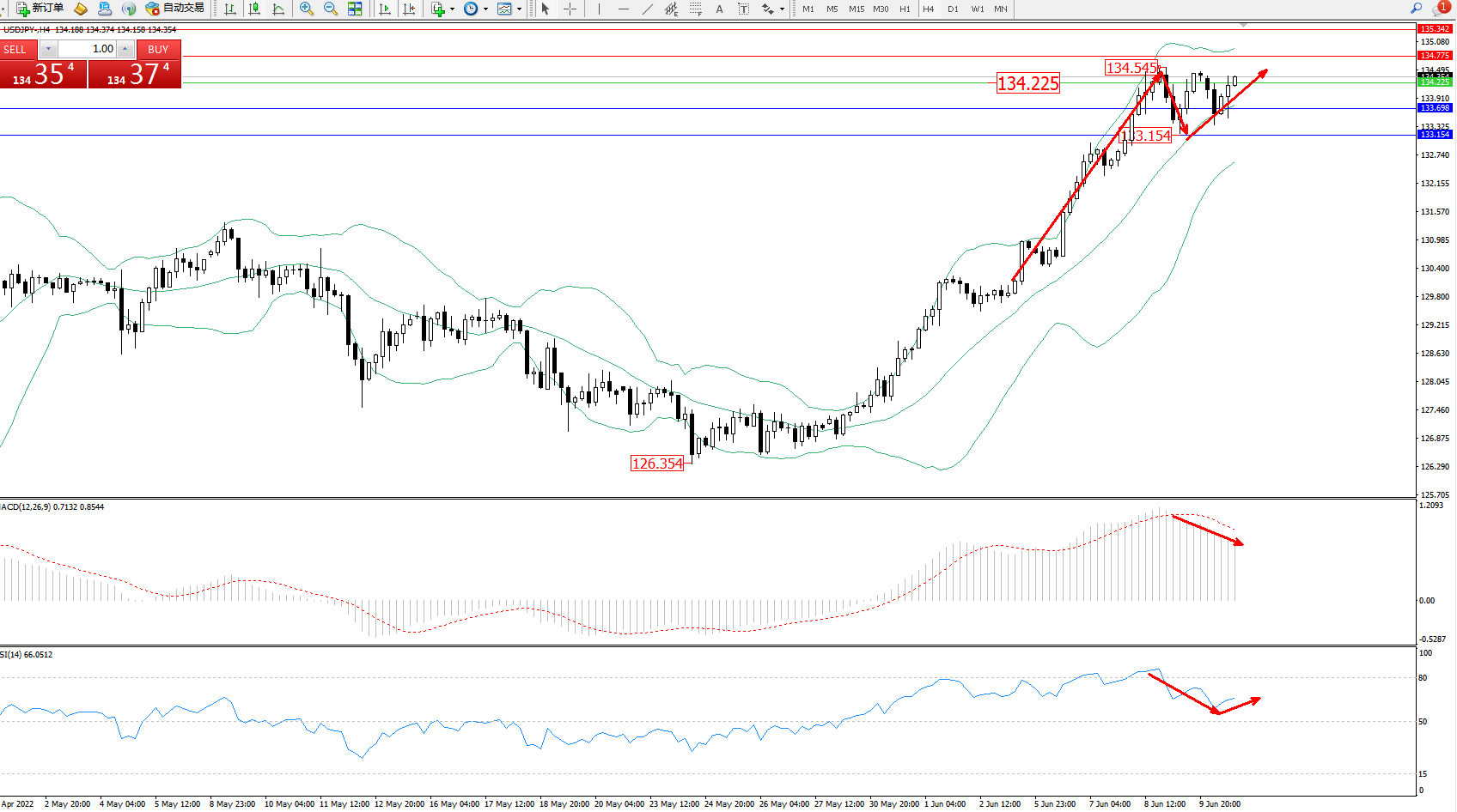 交易策略:134.225上方看涨,目标134.775、135.342