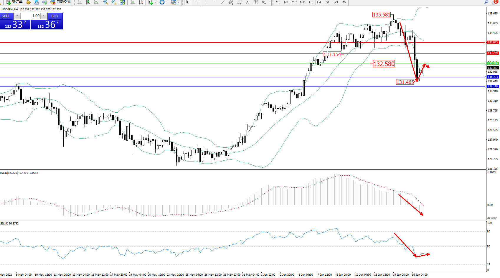 技术点评:空头动力延续布林带指标下轨附近持续震荡下挫,低位抵达131.465附近节点后短期回升,市场整体依旧处于高位震荡后回撤,布林带指标呈张口走势持续中,MACD指标处于空头区域维持弱势震荡下移,RSI指标处于空头区域维持震荡后整理;