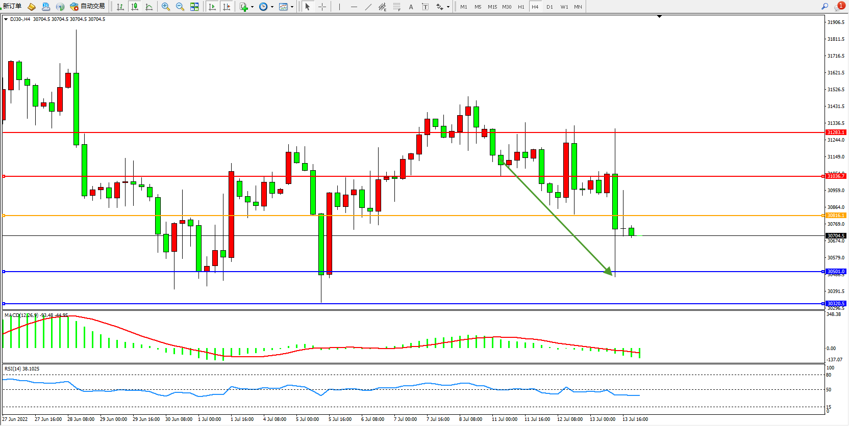 道琼斯指数7月13日(周三)收盘下跌209.79点,跌幅0.68%,报30771.54点;美国的通货膨胀正在加剧。联邦基金期货市场迅速定价美联储加息100个基点的几率为23%的预期。当月CPI能源指数上涨7.5%,贡献了总涨幅的近一半。