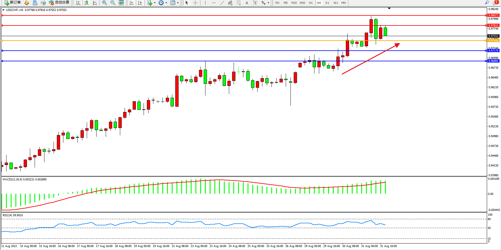 交易策略:0.97428上方看涨,目标0.97815、0.98073