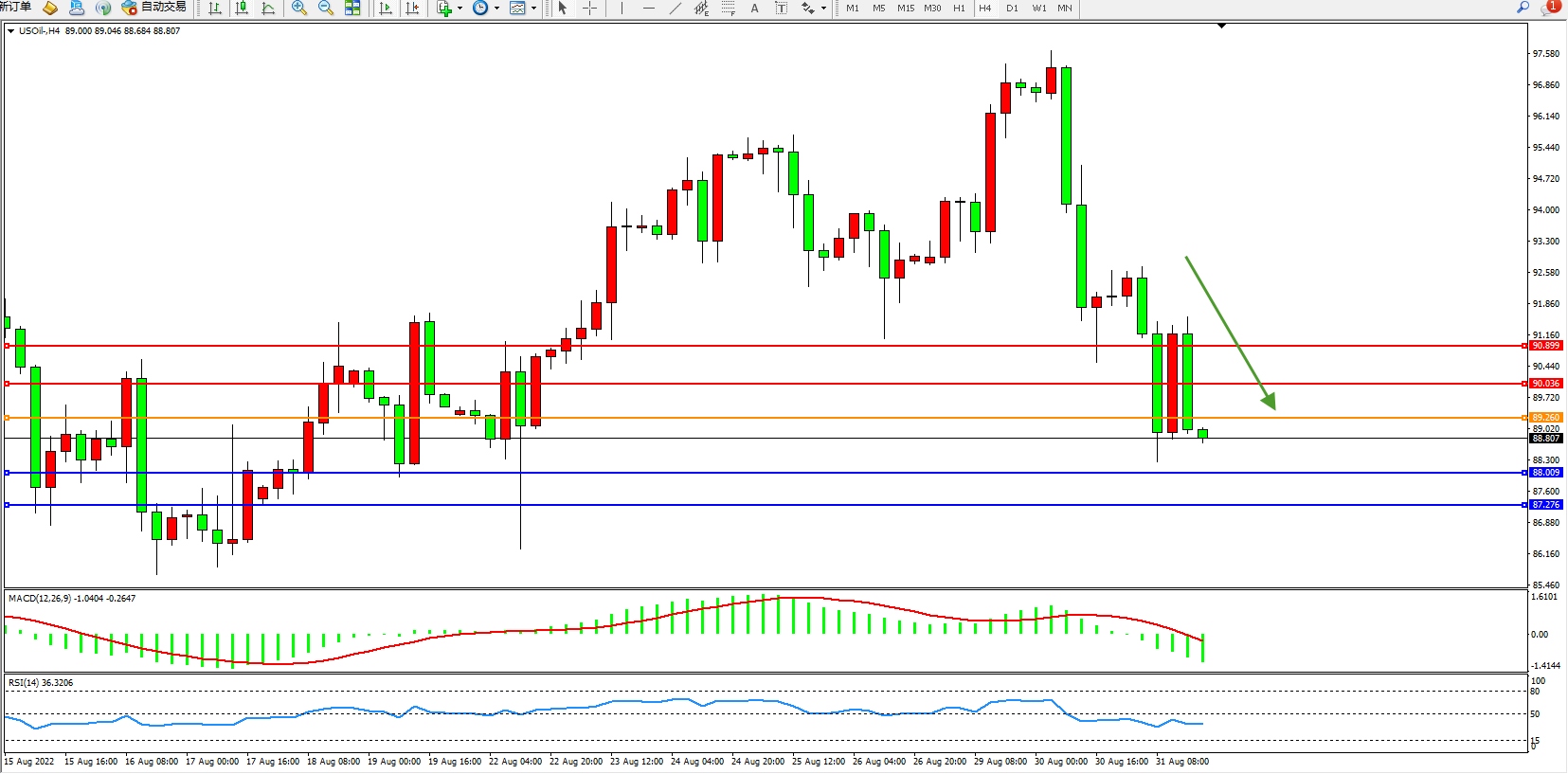 原油维持88.807附近震荡,美国至8月26日当周EIA原油库存 -332.6万桶,预期-148.3万桶,前值-328.2万桶。美国至8月26日当周除却战略储备的商业原油库存为2022年6月24日当周以来最低