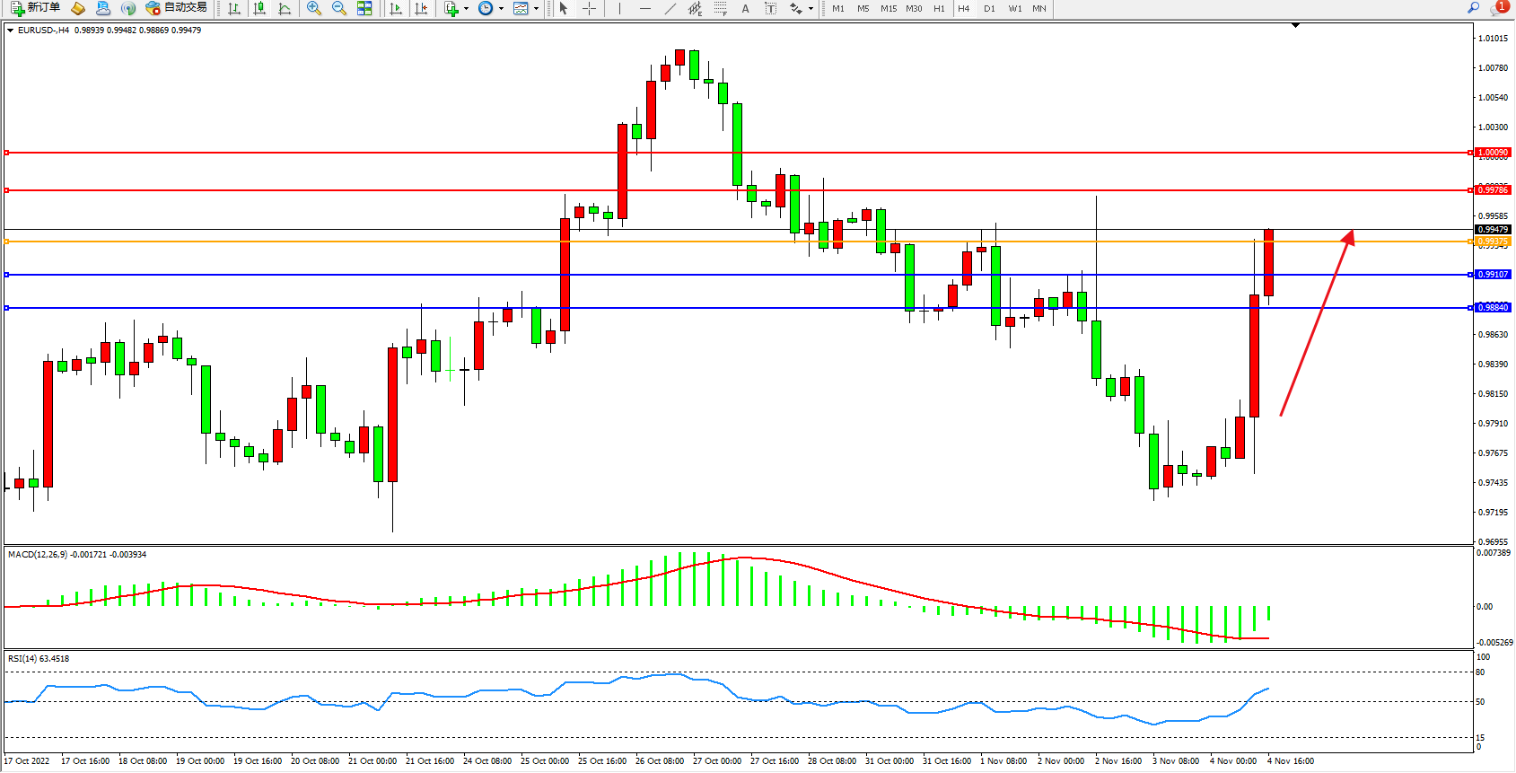 欧元美元EURUSD—4小时K线图显示: