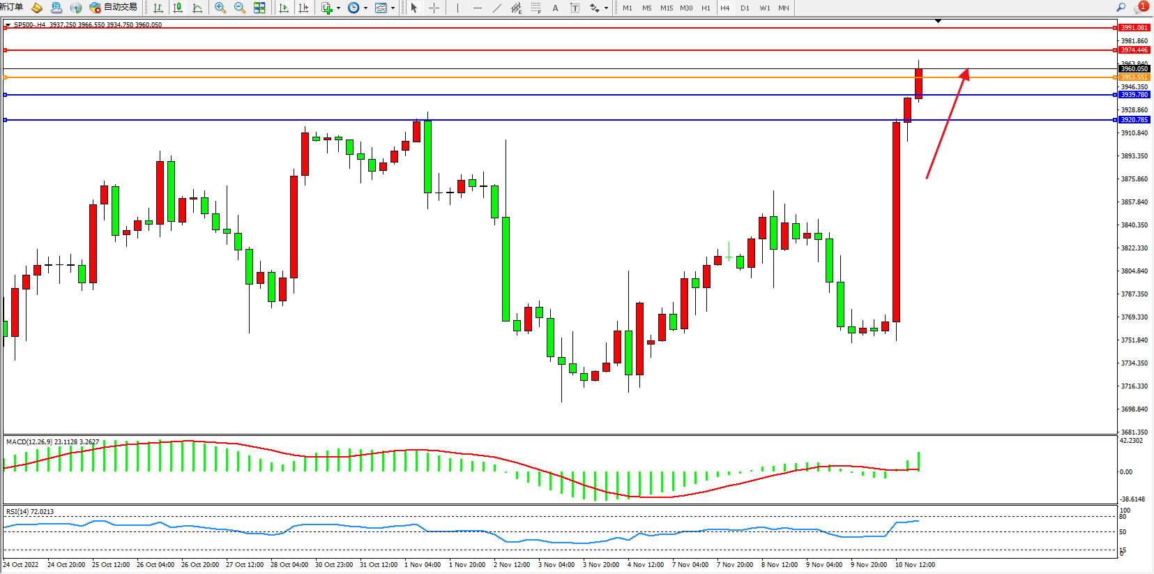 标普500指数11月10日(周四)收盘上涨203.68点,涨幅5.43%,报3952.25点;美国至11月5日当周初请失业金人数 22.5万人,预期22万人,前值21.7万人。利率互换市场下调美联储12月加息75个基点的预期。