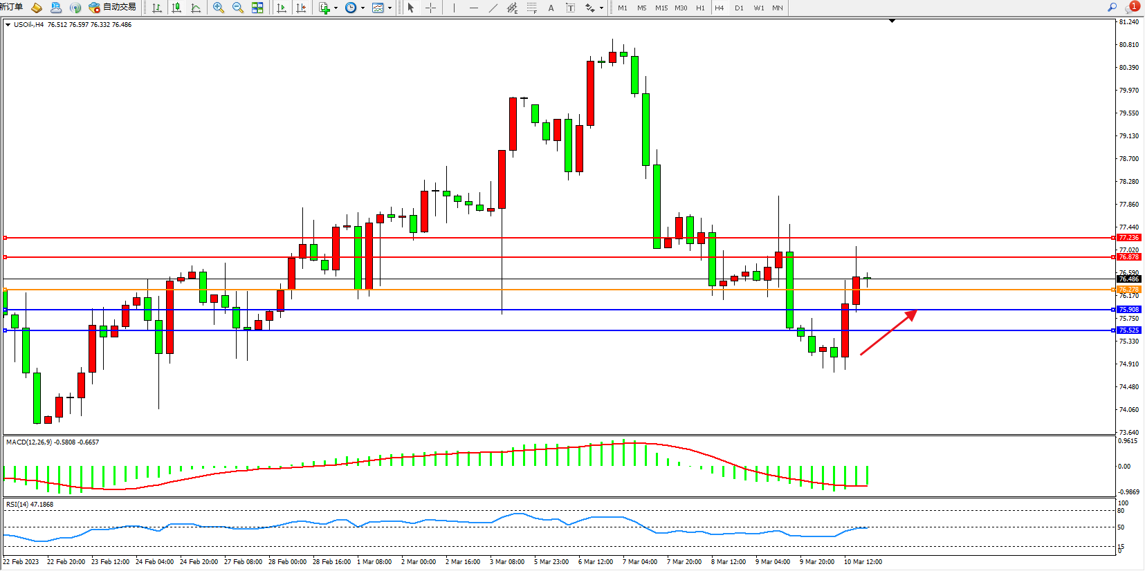 4小时图看:低位多头动力强势反转拉升,短期看涨情绪涌现,市场多头不断向上移动,MACD指标处于空头区域维持整理,RSI指标处于50均衡线附近弱势徘徊;