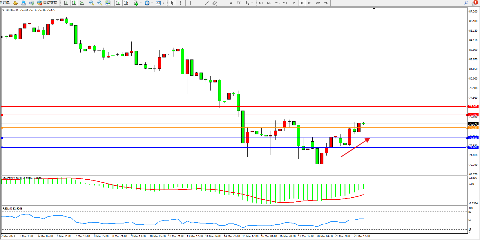 4小时图看:低位多头动力维持震荡上行,短期多头情绪缓慢用下,市场多头动力持续向上移动,MACD指标处于空头区域缓慢上行,RSI指标处于50均衡线附近弱势徘徊;