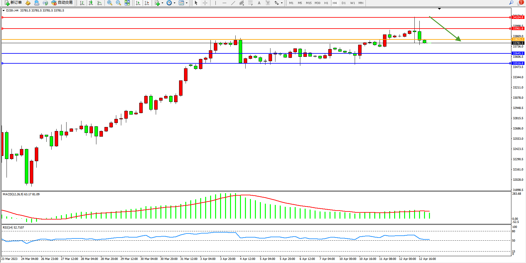 道琼斯指数4月12日(周三)收盘下跌37.57点,跌幅0.11%,报33647.22点;美国3月通胀率降至近两年来最低水平,但核心CPI的上升将继续给美联储带来压力,迫使其在5月份再次加息。