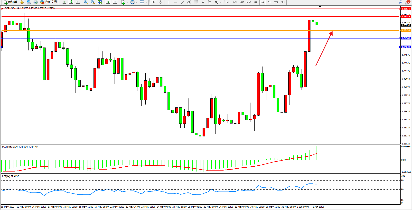 4小时图看:多头动力强势攀升上扬,短期看涨情绪笼罩,市场多头不断向上移动中,MACD指标处于多头区域不断上扬中,RSI指标处于多头区域维持整理;