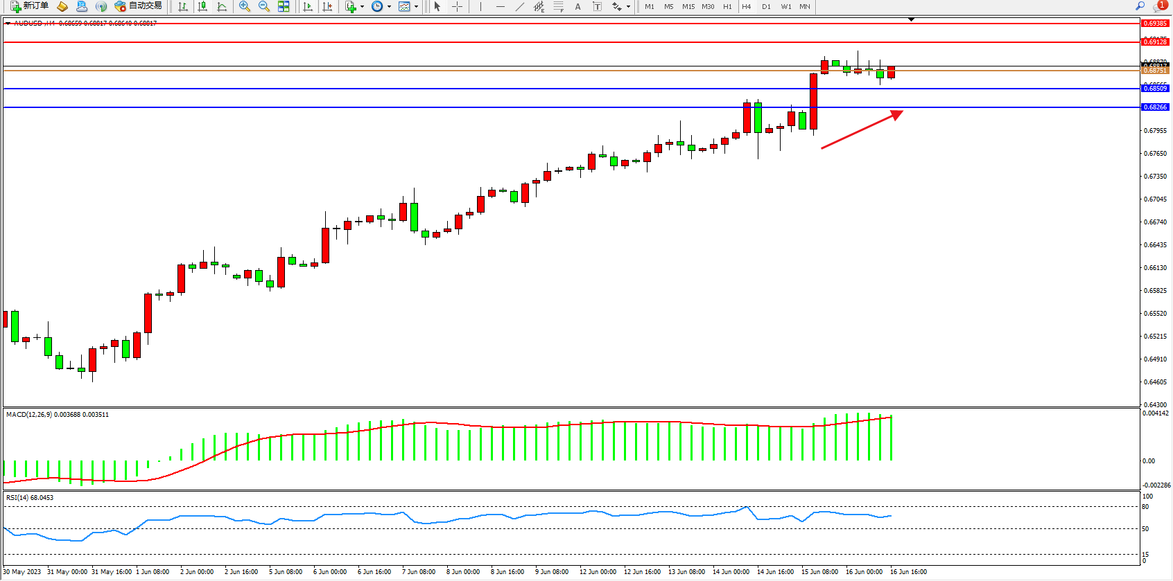 交易策略:0.68751上方看涨,目标0.69128  0.69385