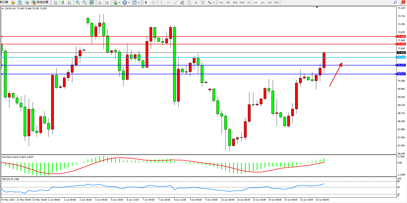 4小时图看:多头动力维持震荡向上移动,短期有继续向上拉升态势,MACD指标处于0轴线市场缓慢上行,RSI指标处于50均衡线上側整理上移;