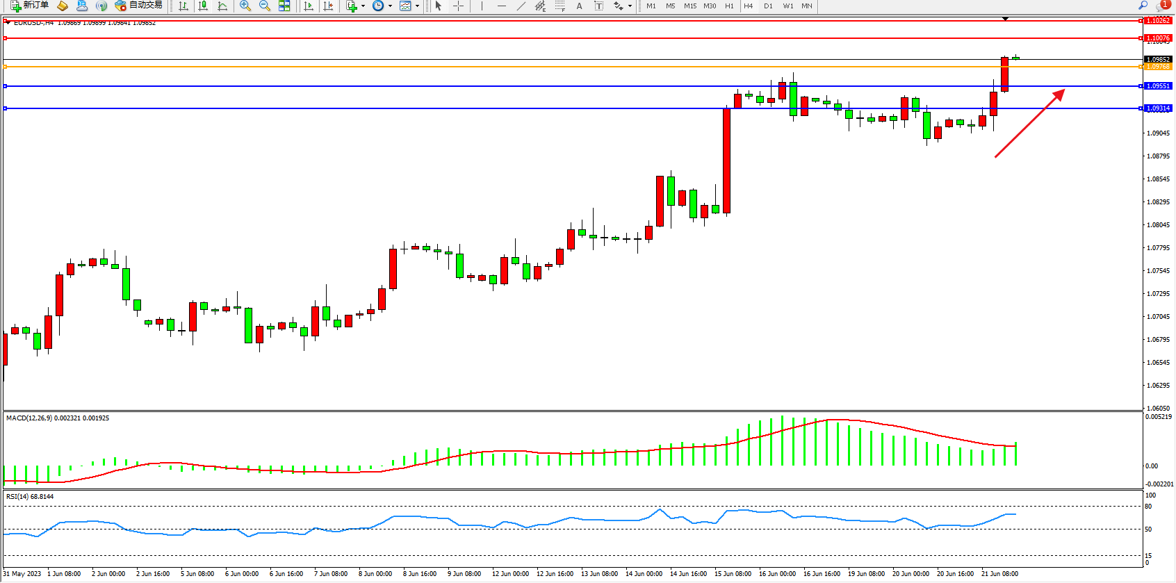 交易策略:1.09768上方看涨,目标1.10076  1.10262
