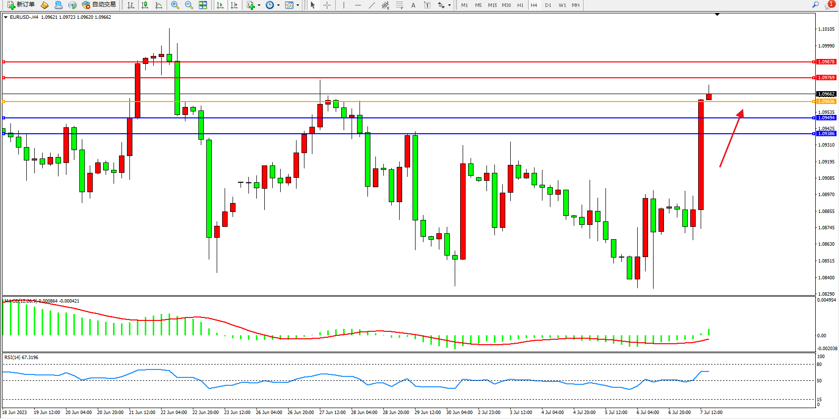 欧元美元EURUSD—4小时K线图显示: